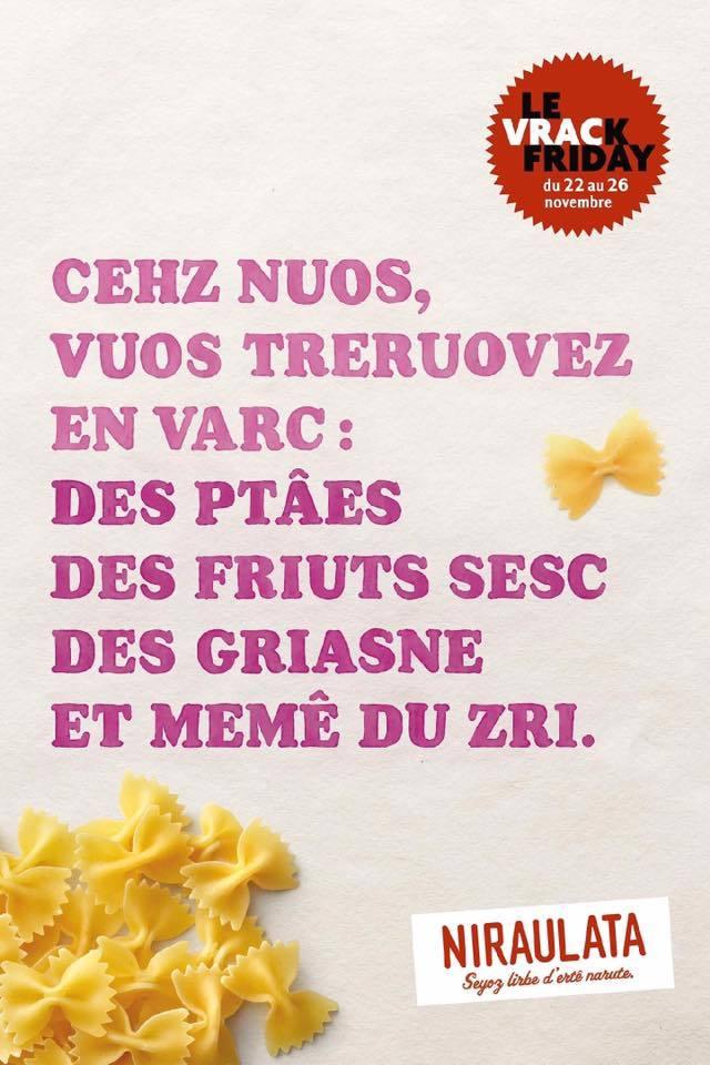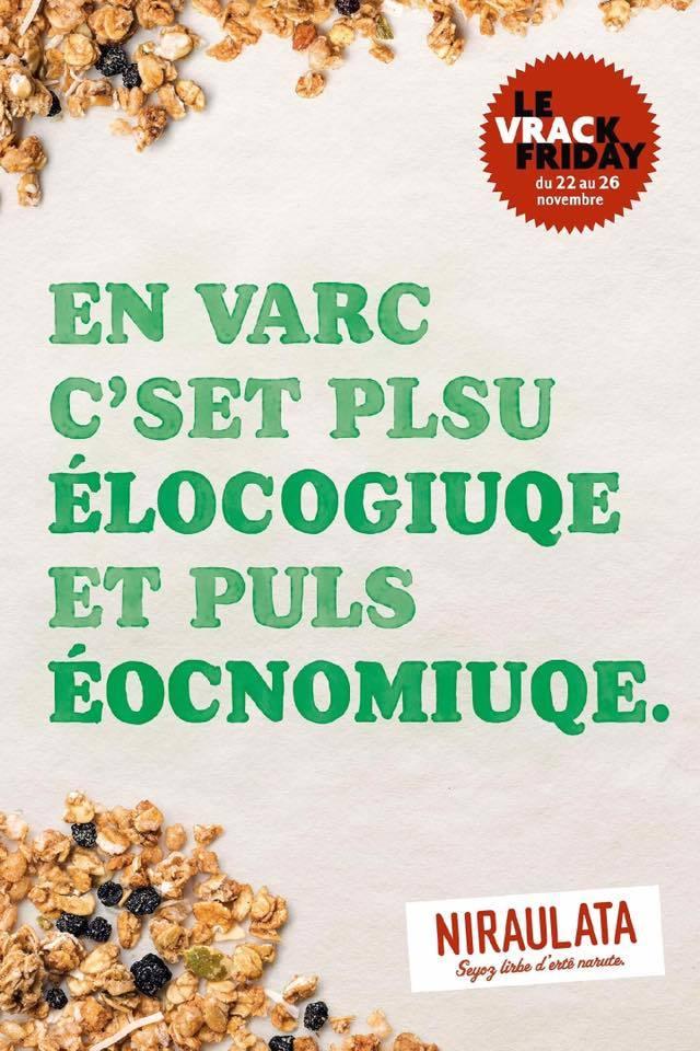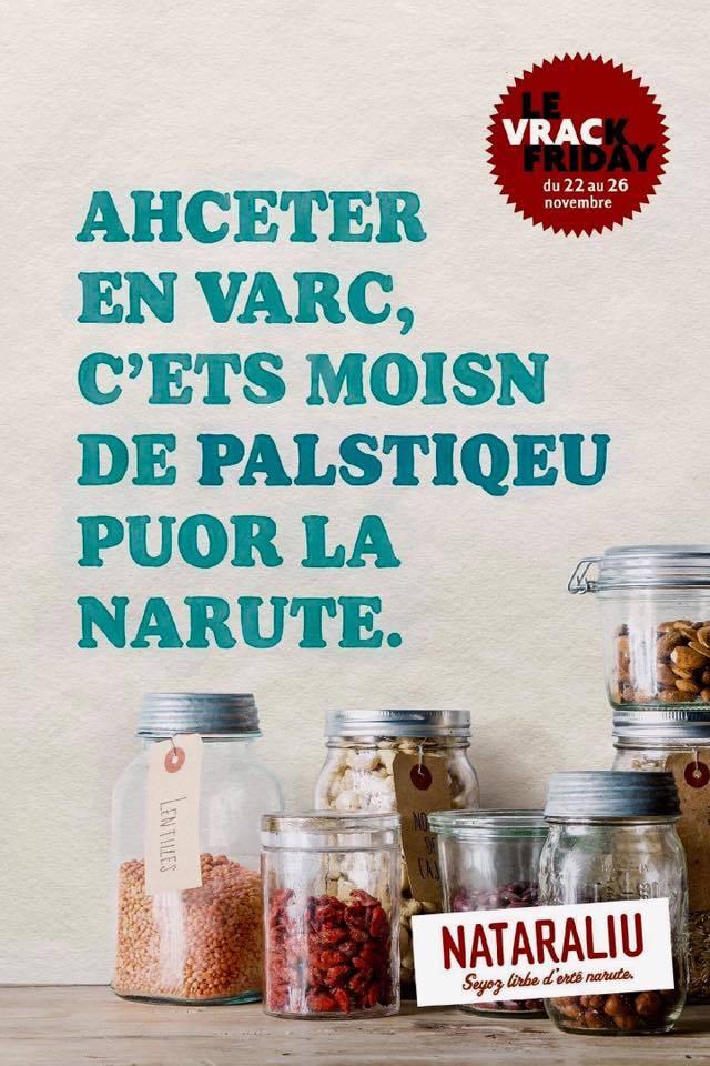 Inutile de vous frotter les yeux ni de chercher vos lunettes. Conçue par Altmann + Pacreau, la campagne surprend. Mais à première vue seulement. Merveille du cerveau humain. À qui il en faut bien plus pour être décontenancé. Comme un clin d’œil au vrac, les créatifs de l’agence se sont amusés à mélanger les lettres des accroches à l’intérieur des mots… Nous replongeant dans nos souvenirs d’enfance. Quand nous étions minots. Et que nous cherchions à reconstituer des mots avec les pâtes-alphabet de notre soupe ! Ici, « riz » devient « zri ». « Nature », « narute ». « Écologique », « élocogique ». Original et ludique. Bref, une idée qui « clack ».