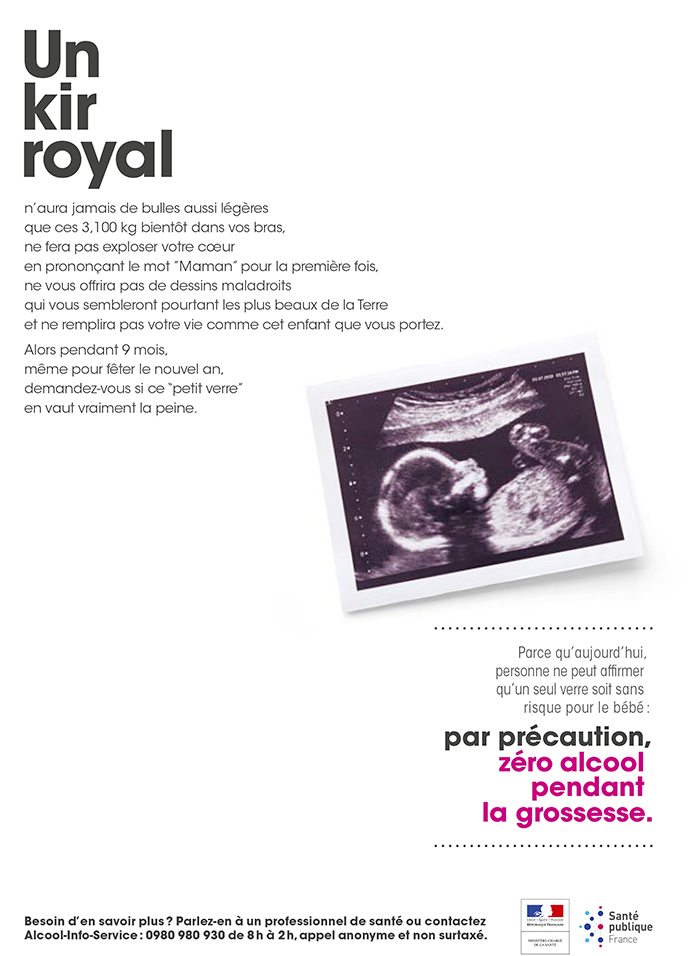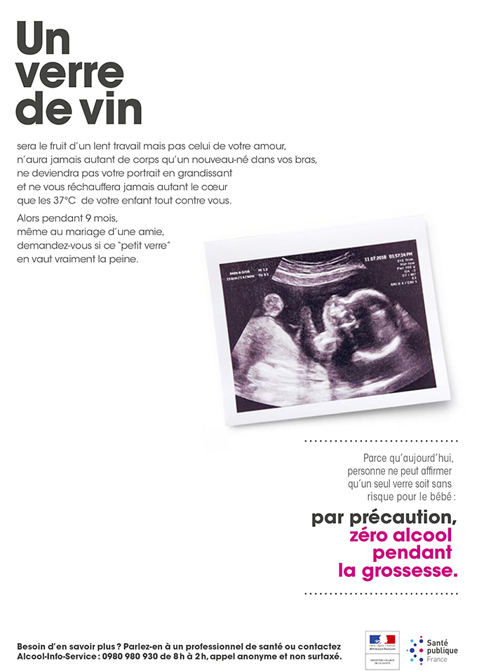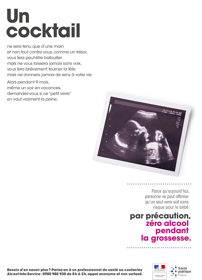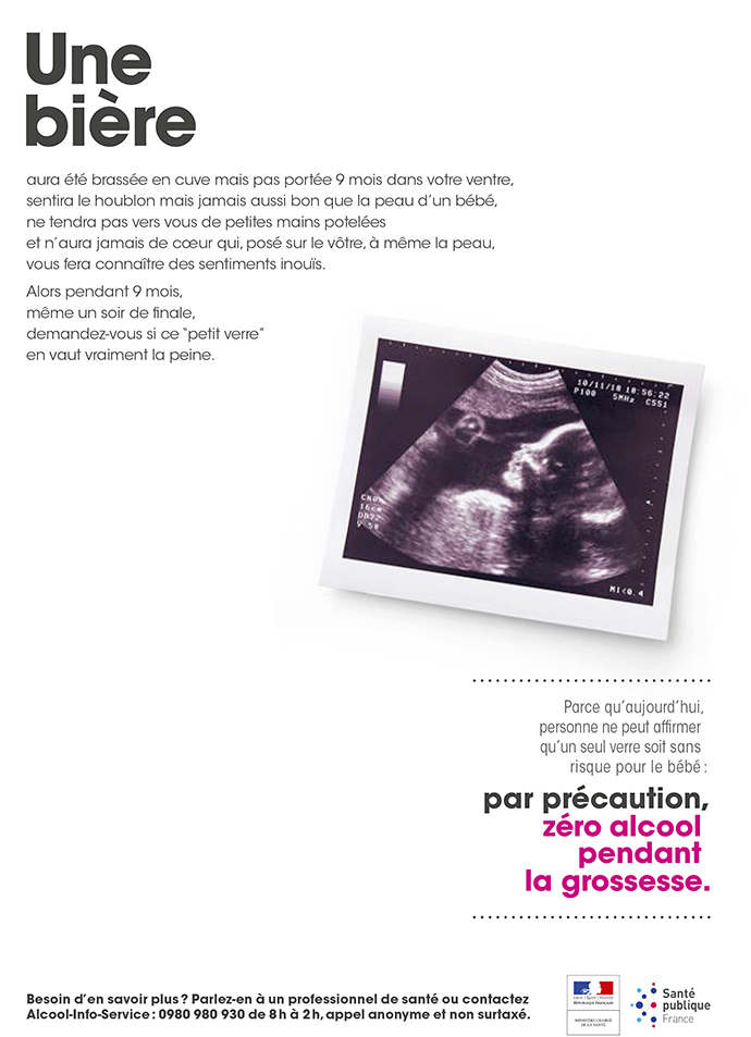 Pour un publicitaire, « la consommation d’alcool pendant la grossesse » constitue un sujet complexe. Parce que la France est une terre de vignerons. Parce que l’alcool est synonyme de fête et que la pression sociale reste soutenue lorsque l’on refuse un verre. Près de 40 % des femmes enceintes pensent d’ailleurs qu’une consommation occasionnelle ne représente aucun danger. Or, personne ne peut prouver qu’elles ont tort. En effet, s’il est admis qu’une forte consommation d’alcool est nuisible, aucune étude scientifique n’a su définir le seuil en dessous duquel il y aurait des risques pour le bébé… Dans ce contexte, toute invitation à la sobriété sera vécue comme la privation de trop pour des femmes auxquelles on a déjà interdit le tabac, certains fromages et le poisson cru et qui entendent profiter librement de leur corps. En parallèle de tout cela, il y a la terrible réalité du Syndrome d’Alcoolisation Fœtale : des milliers de bébés qui, ces dernières années, ont subi retards de croissance, troubles du système nerveux central, malformations ou déficiences intellectuelles ; et le drame familial que cela représente. Situation qui a poussé les pouvoirs publics à communiquer depuis de nombreuses années sur le « zéro alcool pendant la grossesse ». Un mot d’ordre que toute campagne doit impérativement intégrer, tout en ménageant les femmes qui apprennent leur grossesse au bout de plusieurs mois et ont peut-être bu dans l’intervalle.