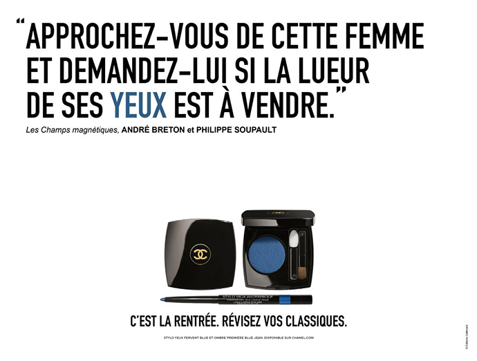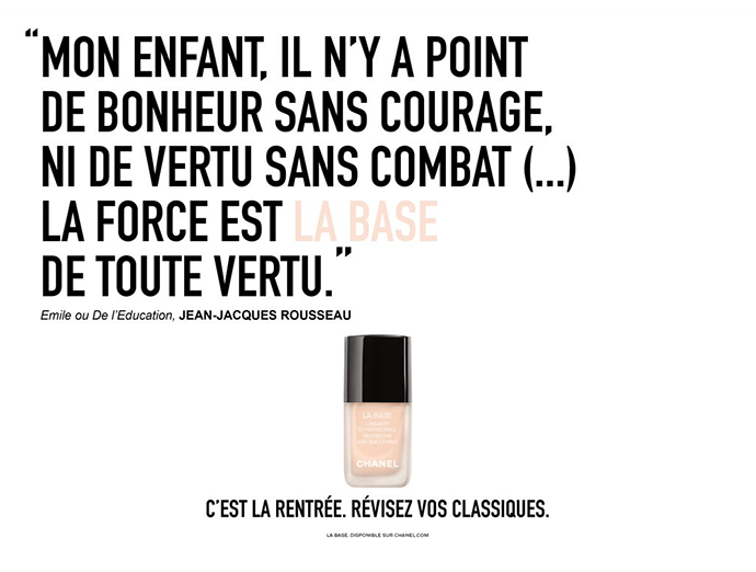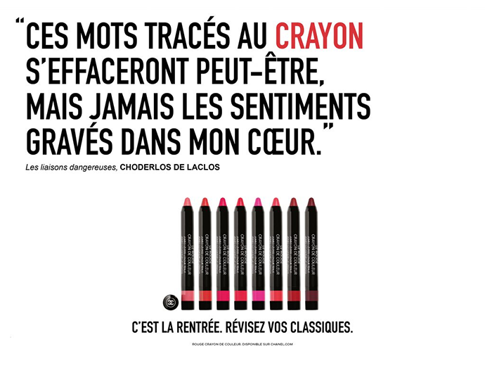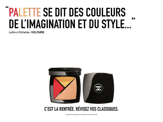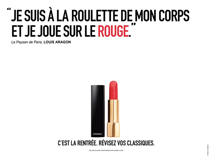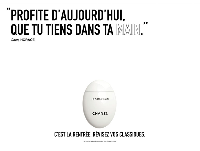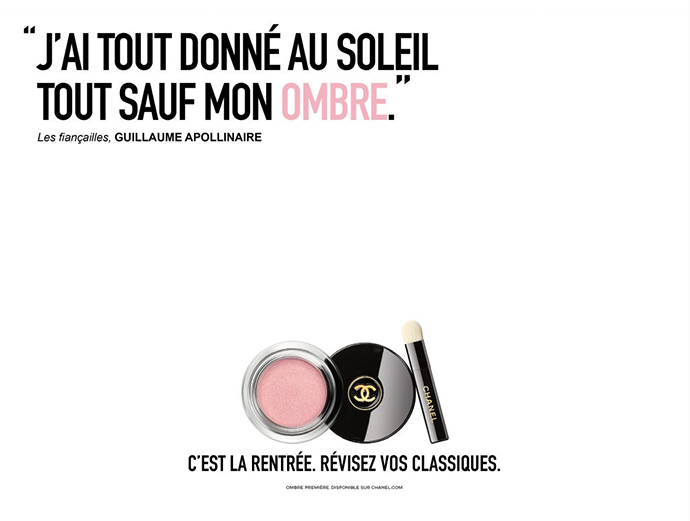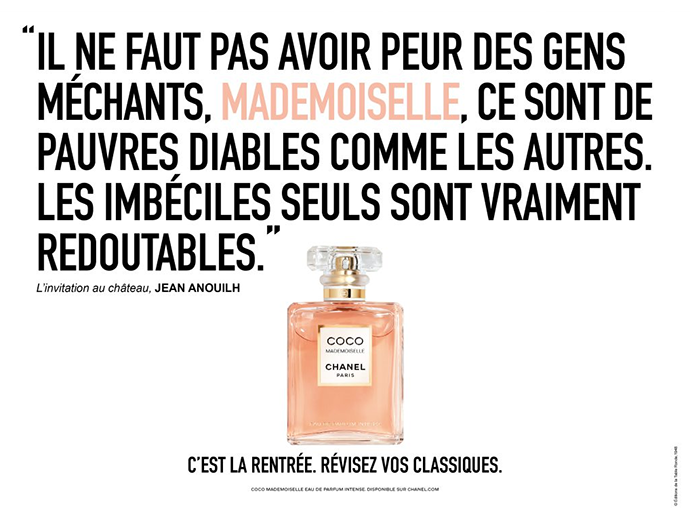 Aujourd’hui même, la célèbre marque de la rue Cambon déploie sur onze affiches sa nouvelle prise de parole, de nouveau dans le métro. Toujours centrée sur le produit. Mais plus aspirationnelle. Et poétique. Signée « C’est la rentrée. Révisez vos classiques », la campagne met en scène parfum, soin et maquillage. Et joue les correspondances entre références littéraires et produits. Pas les Correspondances de Baudelaire. Non, ici, l’ode est aux fleurs du bien. D’Horace à René Char, de Pierre Choderlos de Laclos à Apollinaire, de Jean-Jacques Rousseau à Jean Anouilh, l’art poétique traverse le temps, les genres, les modes. Pour Thomas du Pré de Saint Maur, Directeur des Ressources Créatives de Chanel Parfums Beauté et Horlogerie Joaillerie, « la littérature et la poésie sont autant de moyens de transport vers cette vision intemporelle de la beauté et de l’allure que Chanel cultive avec esprit ». C’est sûr, cette belle campagne nous transportera avec esprit et légèreté dans nos trajets en métro où elle s’affichera jusqu’au 10 septembre !