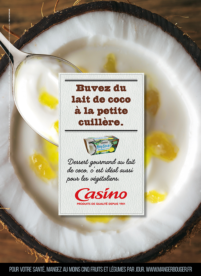 Il y a quelques mois, un débat autour des mots a secoué l’industrie agroalimentaire. La question qui se posait ? Peut-on parler de crème, de fromage ou encore de yaourt quand on sait que ce qui les compose exclut tout produit d’origine animale ? La réponse de la Cour européenne a été claire. Non. Mais pas de quoi en faire un flan (aux vrais œufs et au lait de vache, promis monsieur l’agent) ni de casser trois pattes à un canard quand on connaît les ressources de la langue française. Ni une, ni deux, c’est ainsi que le « yaourt » végétal Casino est devenu un « dessert gourmand ». Une chance que dans la tourmente le « lait de coco » ait fait exception, car là ça aurait pu rendre chèvre le rédac de M&C Saatchi GAD. Mais revenons à nos moutons. D’humeur joueuse, l’agence nous embarque avec cette annonce presse dans ce que le français a de meilleur. Le sens de la formule. Le goût pour la nuance. Alors, il se mange comment ce dessert ? Figurez-vous qu’il se boit à la petite cuillère. Oxymore. Les yeux avertis s’amuseront également du petit « aussi » qui s’est glissé dans la body copy, contribuant à renverser l’équation selon laquelle les produits d’origine végétale se destinent d’abord à une cible végétalienne. De fins détournements qui nous font boire du petit lait.
