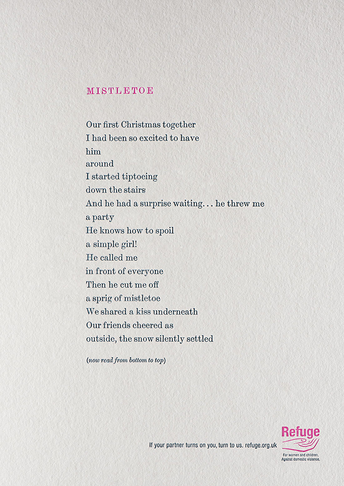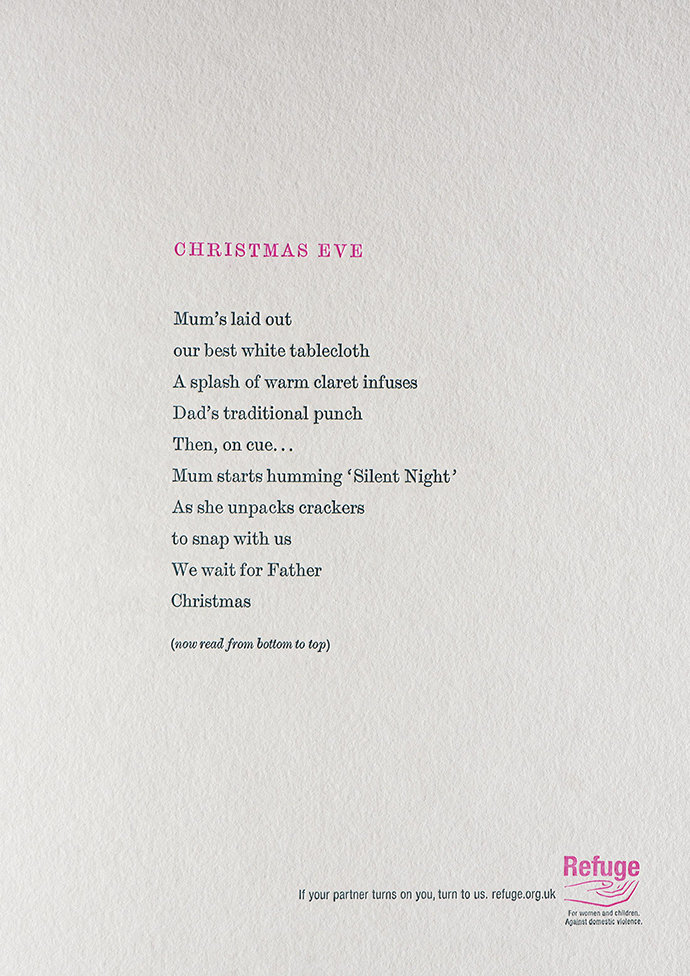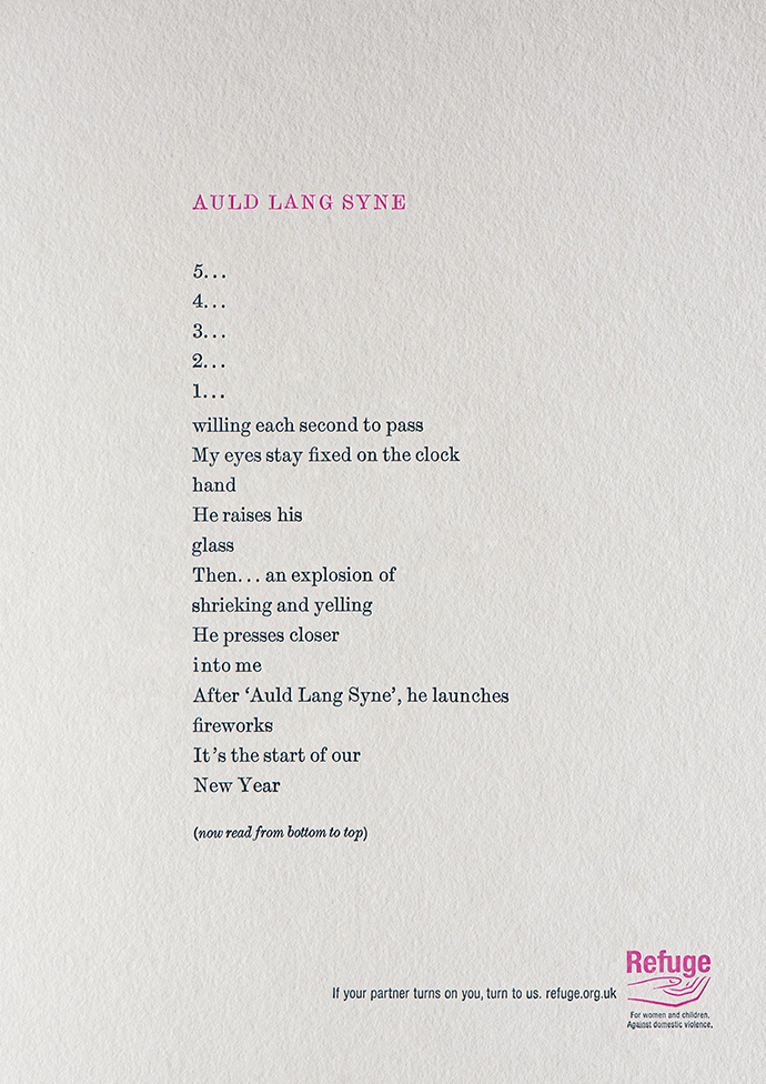 Inutile de tourner autour du pot. La violence domestique tue. Au Royaume-Uni, deux femmes meurent sous ses coups. Chaque semaine. Dans le même temps, trois autres se suicident pour échapper à la violence. Des chiffres qui augmentent les soirs de matchs. Les jours de célébration. Même en période de Noël. Ou au Nouvel An. Pas de trêve. Marche ou crève. Ces drames qui se jouent après le pudding ou sous le gui, l’association Refuge les combat. Au nom des femmes et des enfants en danger. Ses armes ? Les mots. Ceux de l’agence McCann Bristol. Au premier regard, la campagne se compose de poèmes. Légers et innocents. Presque des haïkus. Mais ces odes sont réversibles. Elles font volte-face. Recto, elles narrent la joie liée au réveillon. Le plaisir d’être ensemble. Verso, l’instant où tout bascule. Quand la violence gâche la fête. D’un côté il y a la vie. De l’autre la mort qui rôde. Le procédé rédactionnel n’est pas sans rappeler d’autres campagnes. Il fonctionne malheureusement à merveille. Toutes les lignes se répondent à la perfection. Dans un sens comme dans l’autre. Illustrant ainsi le claim parfait : « If your partner turns on you, turn to us ». En cette période de l’année, la prise de parole devient main tendue. Pour que cesse le cercle vicieux de la violence familiale. Et que s’ouvre pour les victimes une année plus sereine. À l’abri. Comme un havre de paix. Un Refuge.