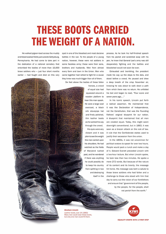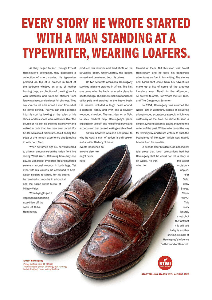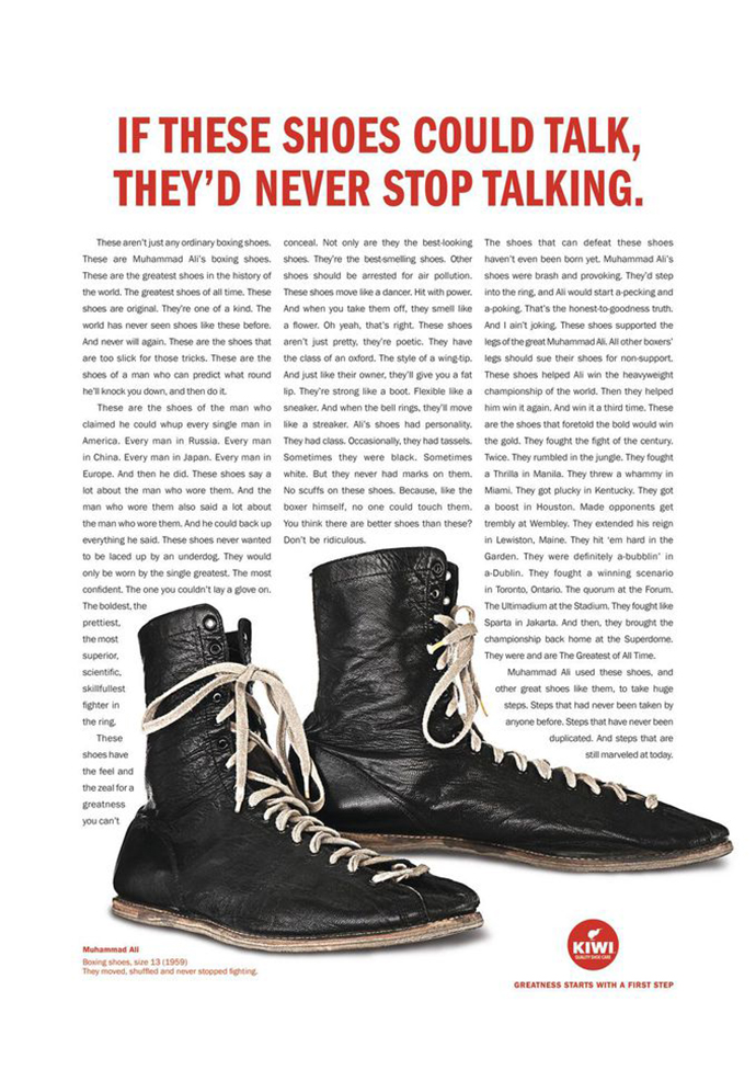 Une paire de chaussures. Une marque de cirage. Quoi de plus évident ? Qu’est-ce qui a bien pu passer par la tête du jury pour récompenser ça ? Avec en prime un Grand Prix en Industry Craft en Copywriting. C’est juste que ce ne sont pas des chaussures anonymes. Et que l’histoire qu’on vous raconte va vous captiver. Une magnifique leçon de storytelling. Pas écrite avec les pieds.