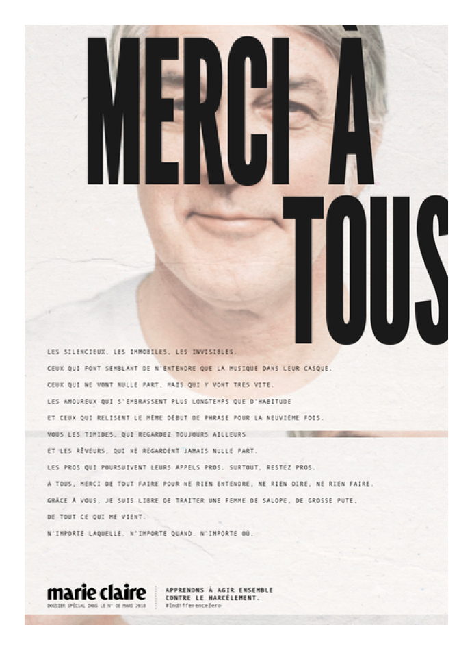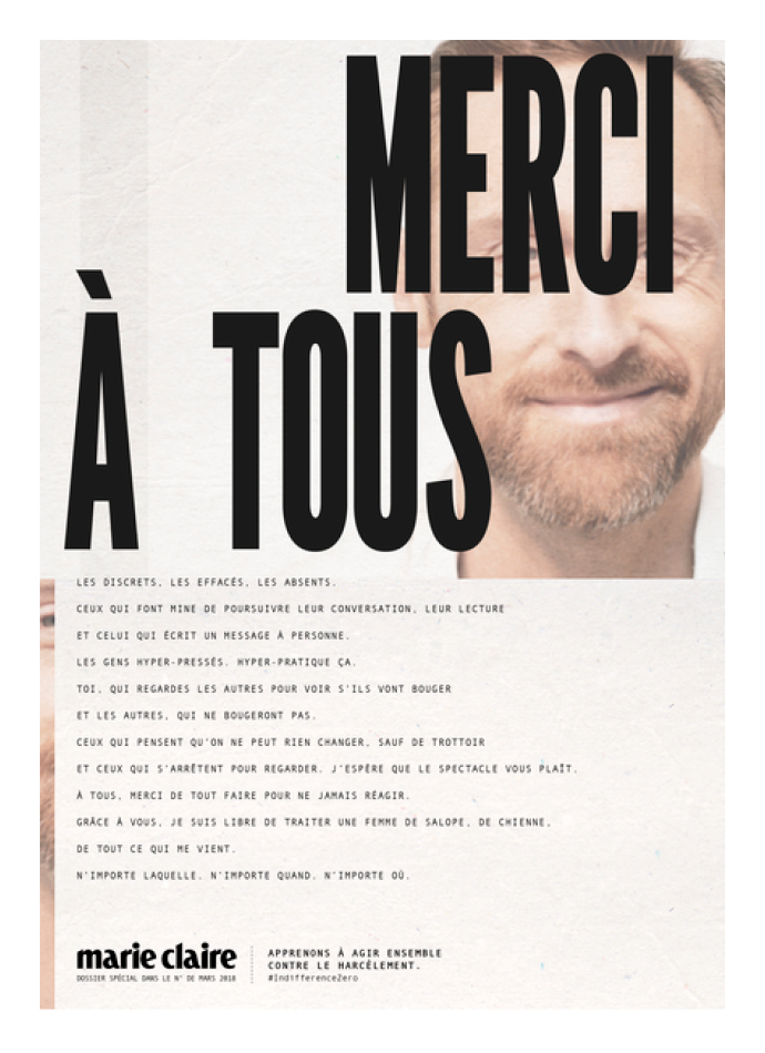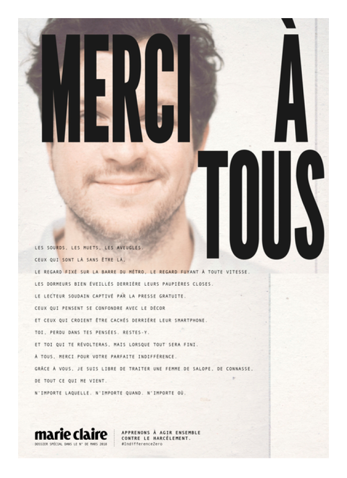 Comme pour le Play-Doh, on avait déjà salué à la RRédacs cette campagne puissante. Et l’utilisation violemment ironique du « Merci » des harceleurs face au silence de tous. Le saluage, désormais international, reste de rigueur.
