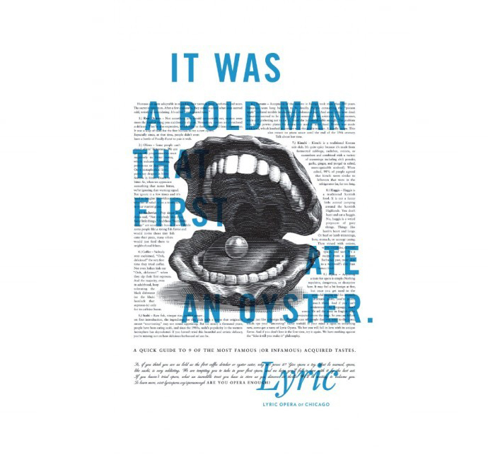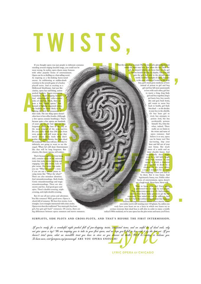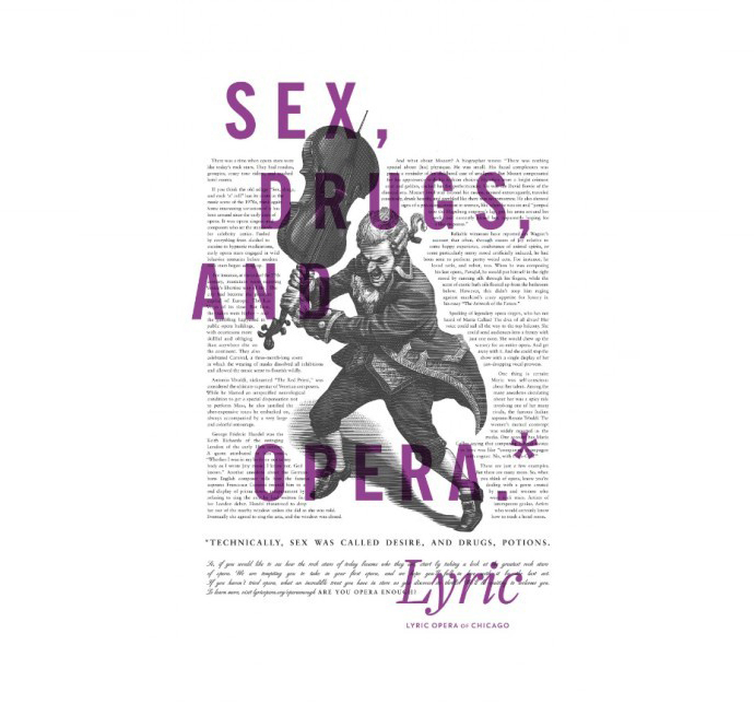 Comment redonner envie aux jeunes de s’intéresser à l’opéra. Avec du digital ? Que nenni ! Et si on faisait plutôt de la presse avec deux colonnes de texte et des vieilles gravures ? Bingo. Par la qualité de l’écriture et l’anglage de chaque annonce, l’Opéra de Chicago donne envie. Une mention spéciale à l’annonce « Sex, drugs and opera* ». Et cette incroyable légende à l’astérisque de l’accroche : « Technically, sex was called desire, and drugs, potions. »