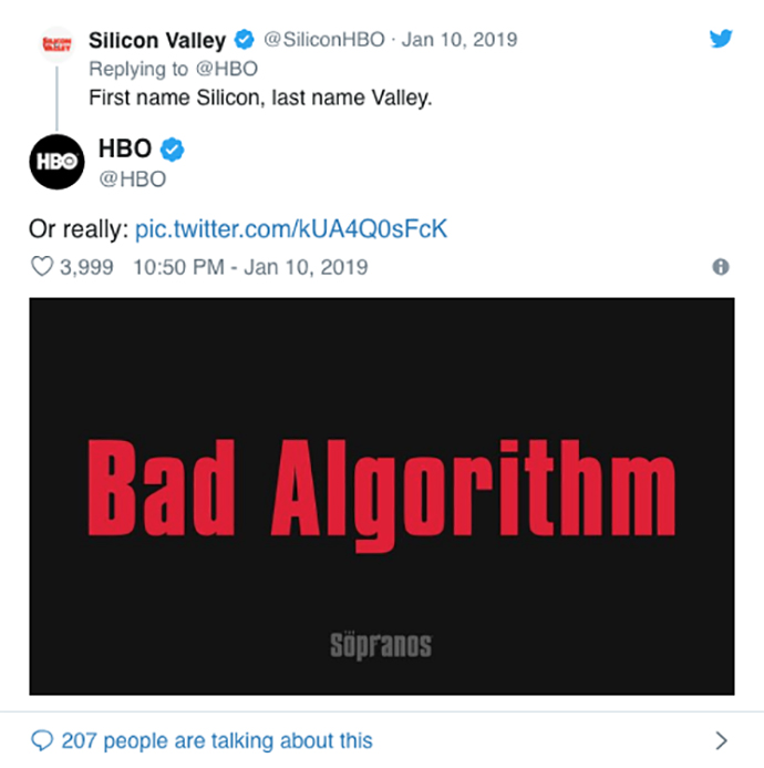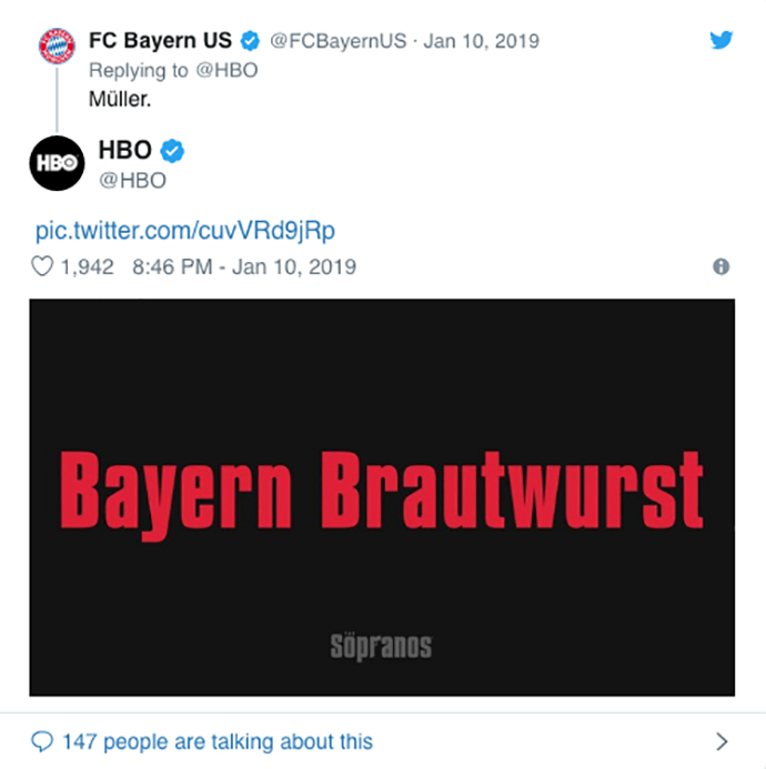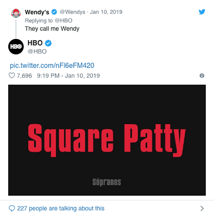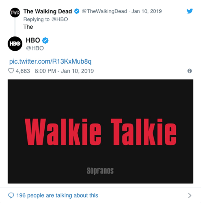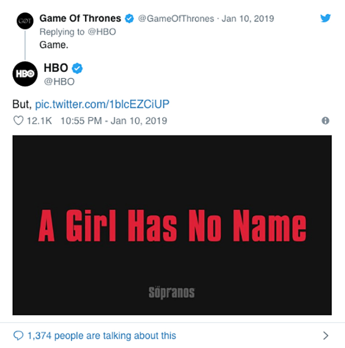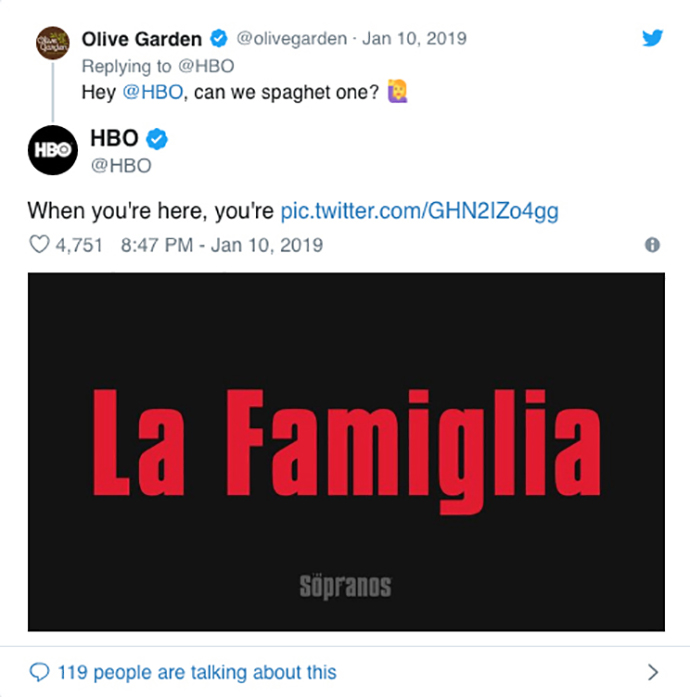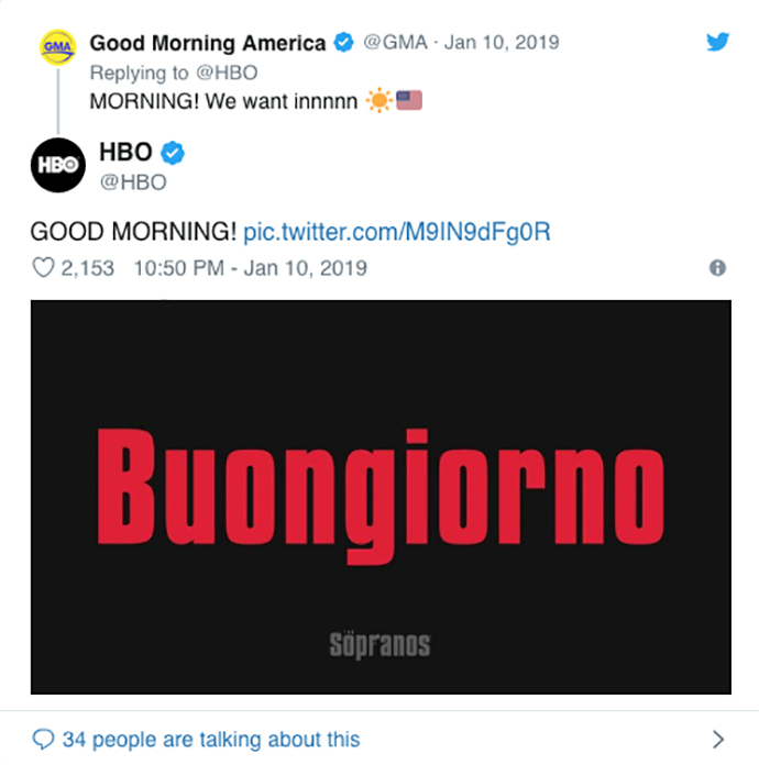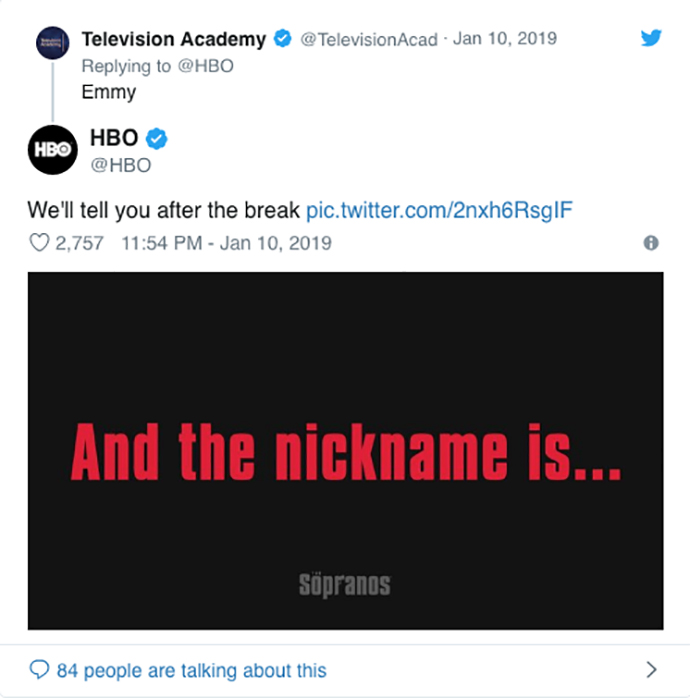 Du petit matin à la fin de la soirée, le compte Twitter de HBO s’est affolé ! Aux manettes de l’opération, l’agence Engine Content. Son concept ? Inviter les twittos à se manifester pour se voir attribuer un surnom italiano-mafioso. Une fois trouvé, le surnom était simplement posté par la chaîne sur son compte. En typo rouge sur fond noir. Sans hashtags ni aucun autre élément de com. Simple et efficace. La recette des gangsters. Une belle façon de rendre hommage à l’esprit de la série, vingt ans après la diffusion du premier épisode.