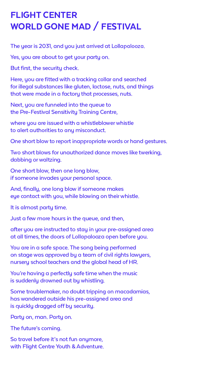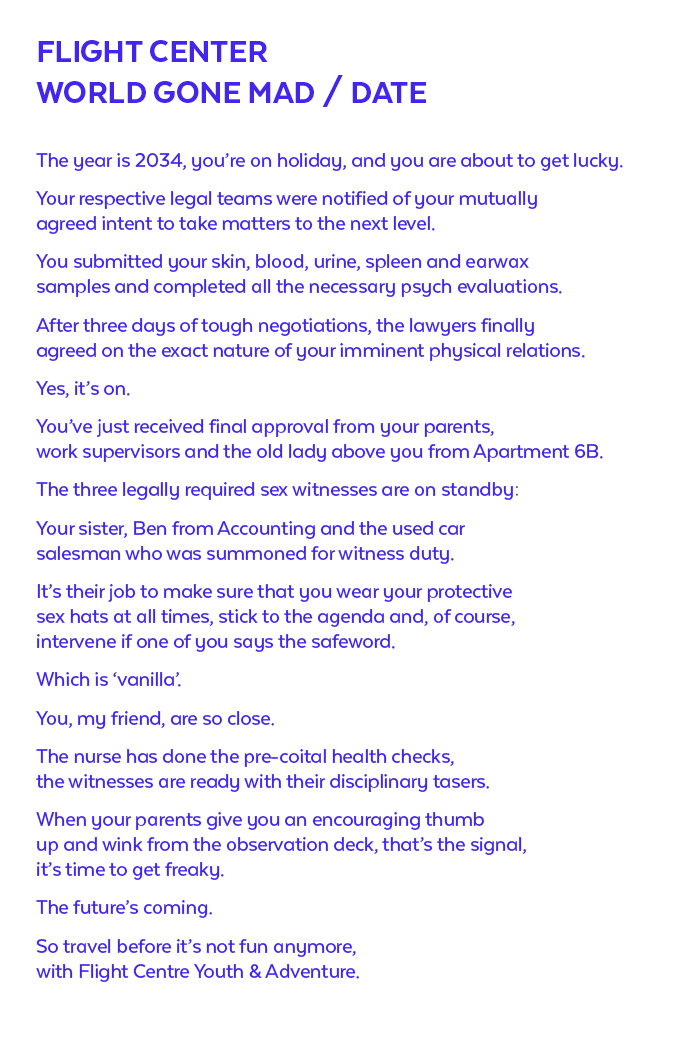 Les futuroptimistes qui vous parlent de l’avenir vous désolent ? Vous vous rangez plutôt dans la catégorie sceptiques, voire inquiets ? Flight Center aussi. Découvrez le monde de demain que la marque décrit. Un futur dans lequel avoir un rendez-vous amoureux et se préparer à l’acte sexuel deviennent un chemin de croix juridico-hygiéniste. Ça fait peur. Il est encore temps de voyager.